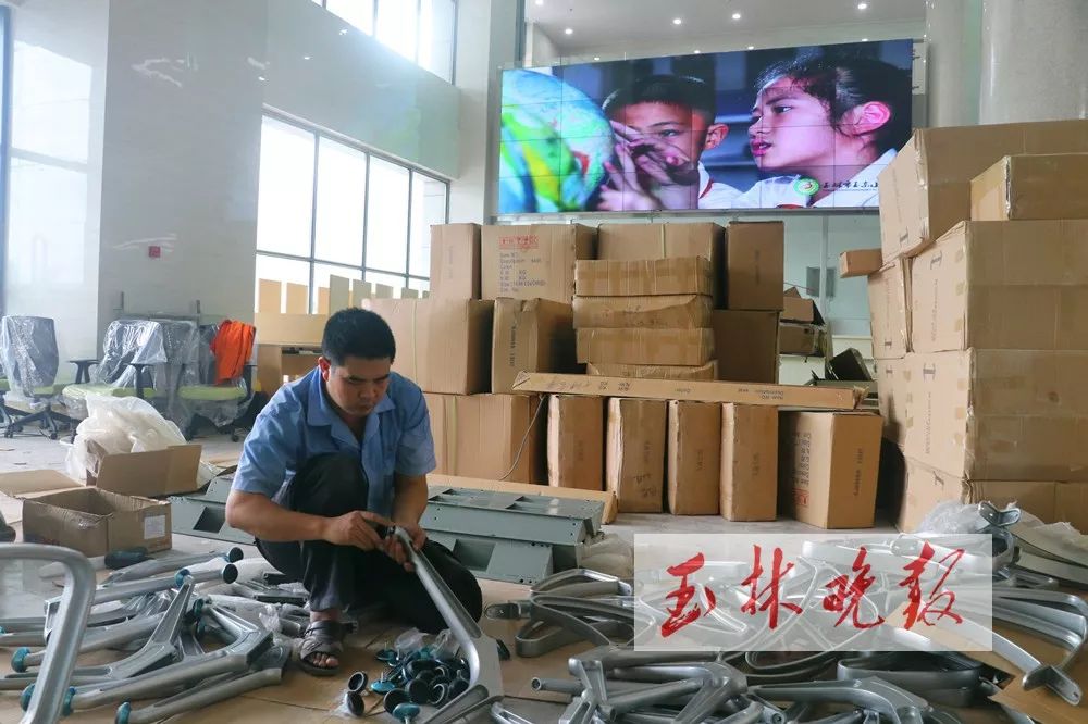 大厅里,桌椅等办公用品也逐渐就位,工人正在忙着进行分拣、安装。沿着大厅右侧的弧形楼梯往上走到二楼,看到各种装修已基本完成,电梯等设备也已安装好,工人正在检查调试。