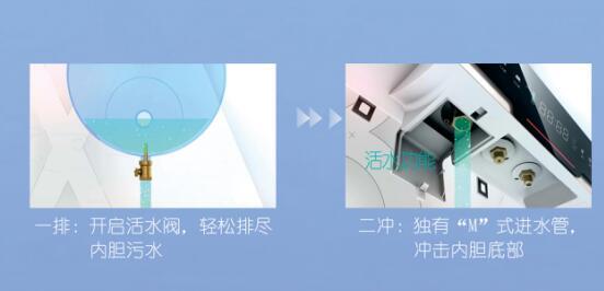 博远(活水版)系列排污口采用活水阀的设计,只需轻轻一拧,即可轻松排尽内胆污水。独有的“M”式进水管,可以冲击内胆底部,一排二冲,加强内胆中水的流动性,避免细菌滋生。